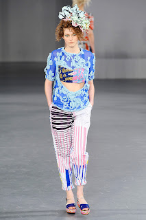 Holly Fulton still stands for extremely original Art Deco-esque patterning but this time (Spring 2012) combined nicely with zebra, checkerboard and oh-so-trendy this season ocean motifs. All this variety of forms was shown off on simple shapes with top-notch miniskirts waving the flag for the brand as one of its trademarks. Fulton also keeps herself on a very high level with the exquisite jewellery she produces and tries to experiment with fabrics - as you might have not noticed the zebra pattern on strapless top (second pic) is actually intarsia knit - the result of special collaboration with a Scottish textile mill.